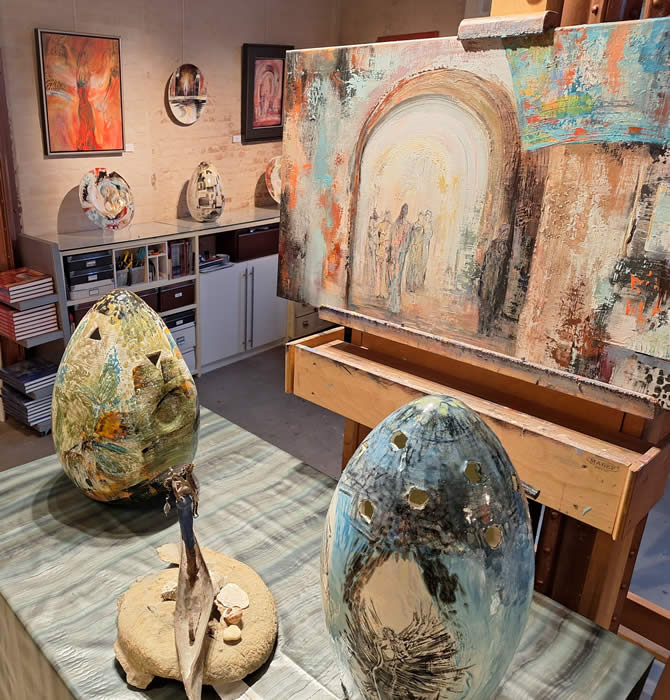 detailfoto van het atelier van Toos van Holstein bij de opening van het nieuwe jaar van de Kunst&Cultuurroute Middelurg op zondag 1 februari |